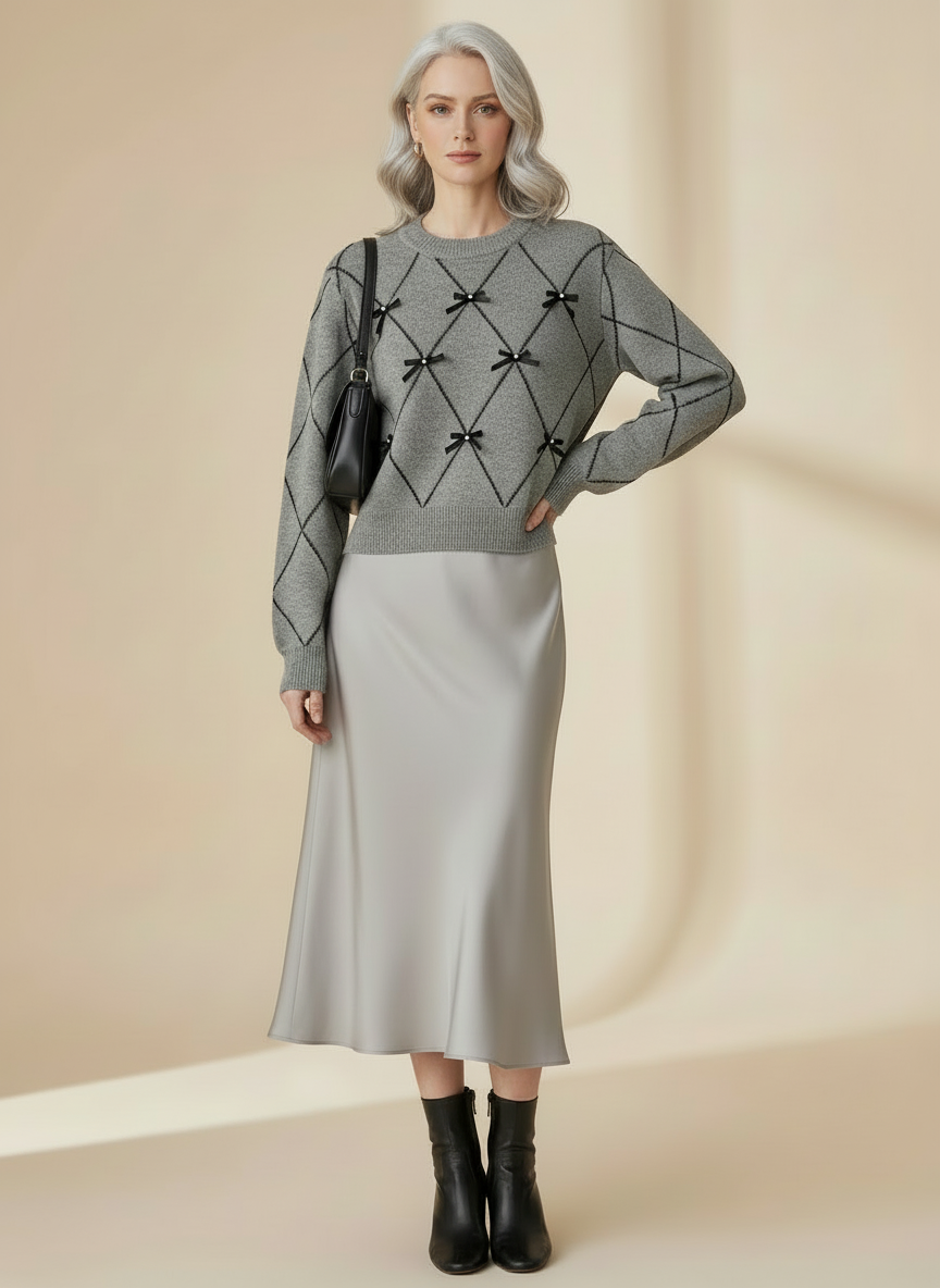 Step into timeless elegance with this diamond bow knit top — a perfect balance of sophistication and playful charm. Designed with a delicate diamond pattern and dainty bow details, it brings a touch of romance to your everyday style. The soft knit fabric offers a comfortable yet polished fit, while the classic crew neckline and relaxed silhouette make it easy to dress up or down. Pair it with a pleated skirt or tailored pants for a look that’s effortlessly chic and feminine.