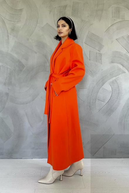 A refined wrap coat that brings structure and ease into the same silhouette. The bold orange tone adds a touch of warmth and intention — a color that feels confident without needing to be loud. Soft tailoring shapes the shoulders and lapel, while the self-tie belt allows the fit to settle naturally against your frame.