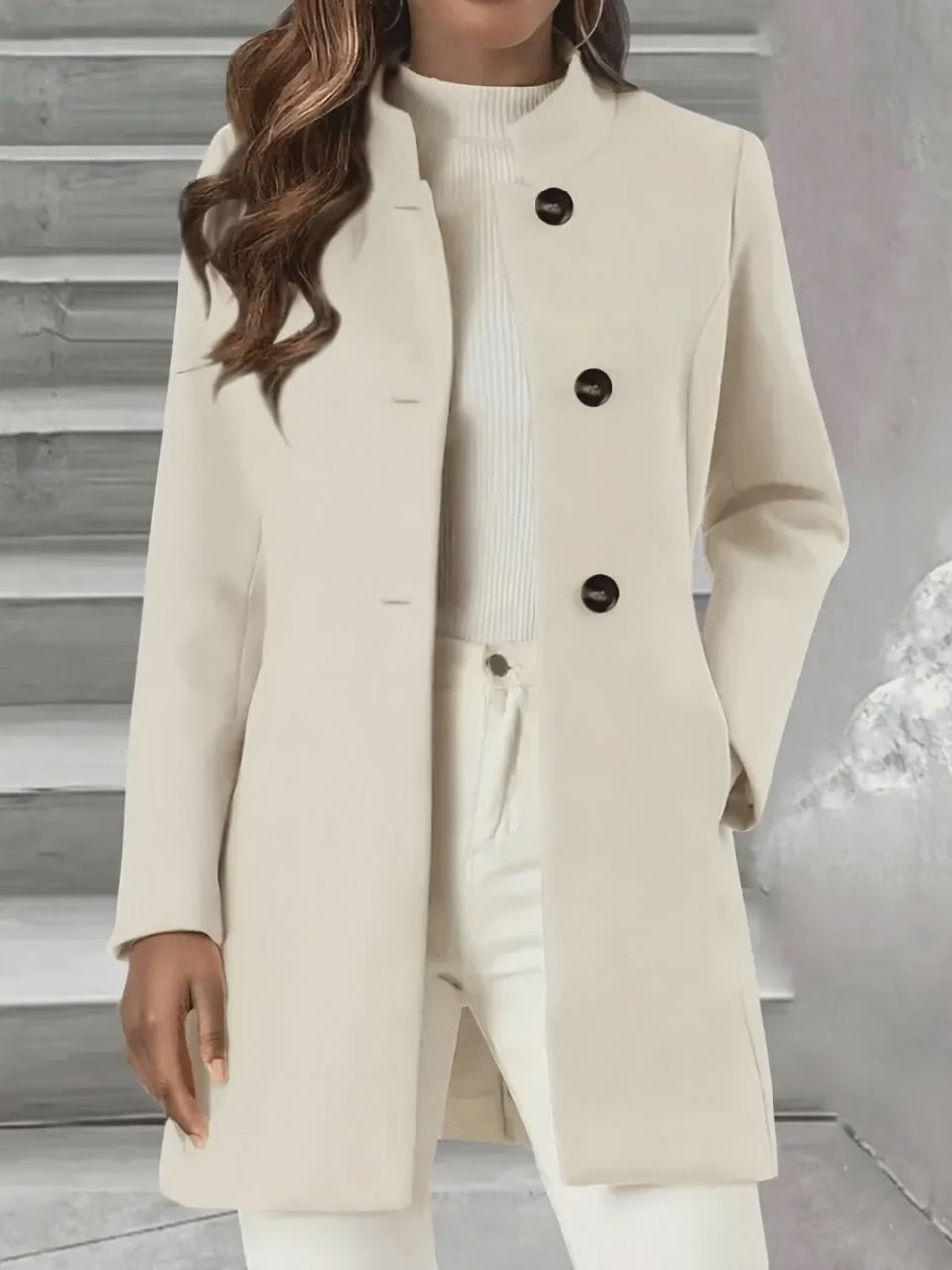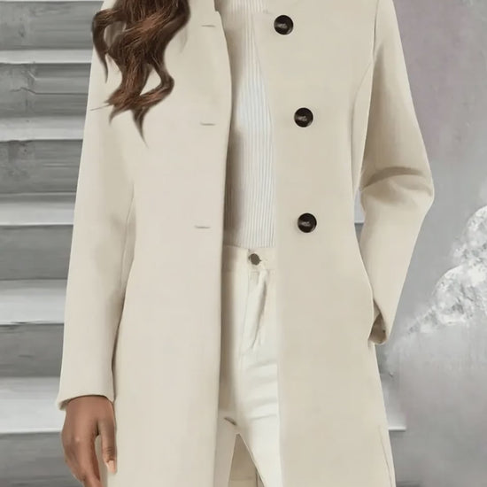 Wrap yourself in refined confidence with this single-breasted stand-collar coat, a flawless blend of minimalism and sophistication. Its clean, structured silhouette flatters effortlessly, while sleek black buttons add a bold touch of contrast. Smooth long sleeves and a tailored fit create a polished profile that pairs beautifully with anything from denim to polished trousers. Finished with side pockets for both practicality and poise, this coat elevates everyday style with modern elegance.